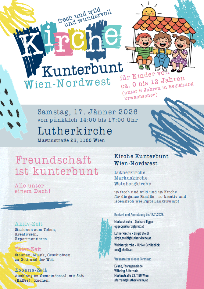 7. Januar 2026 Freundschaft ist kunterbunt – Alle unter einem Dach! Samstag, 17. Jänner 2026 von 14:00 bis 1:00 Uhr in der Lutherkirche. Für Kinder von 0 bis 12 Jahren.